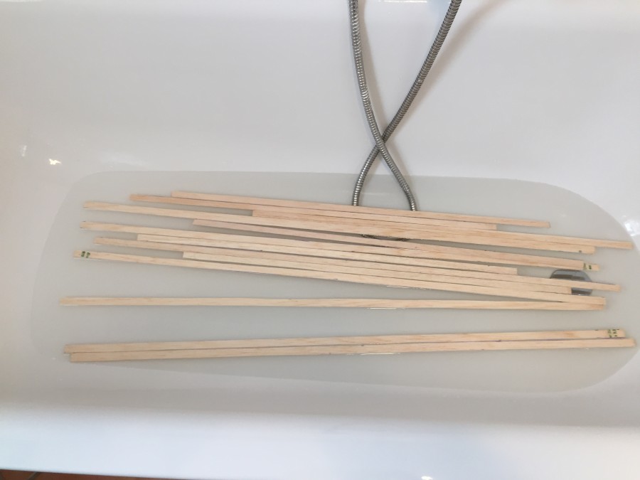 Lagen 2mm Balsa lamelliert. Diese Balsastreifen wurden zuvor einige Stunden in der Badewanne gewässert und dann um