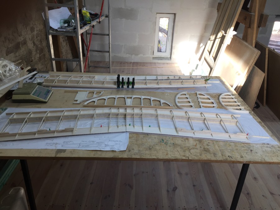 Nachdem die Tragflächen teilweise beplankt wurden, habe ich sie vom Bautisch genommen.