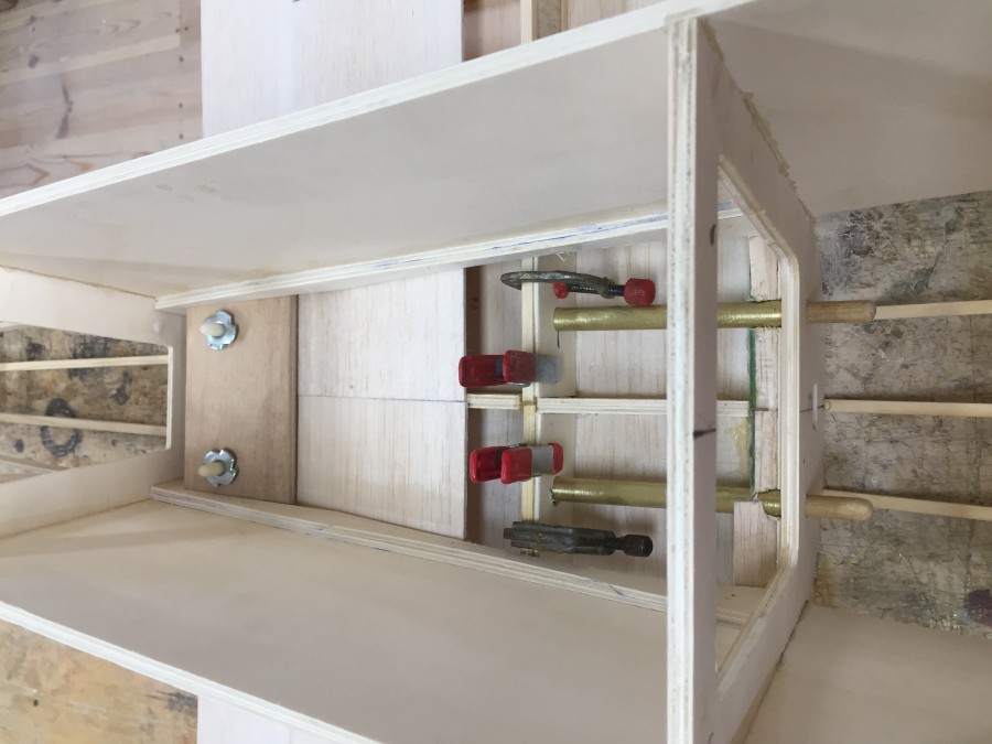 Bereich drei Gurte aus 5x5 Kiefer eingezogen. Diese waren nicht vorgesehen. Später folgt noch eine Beplankung aus 2mm