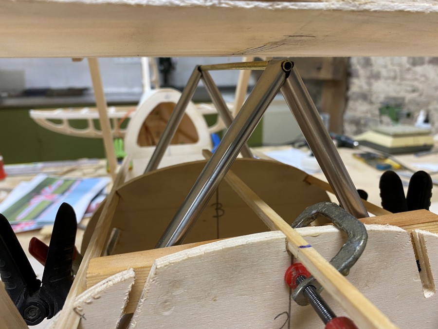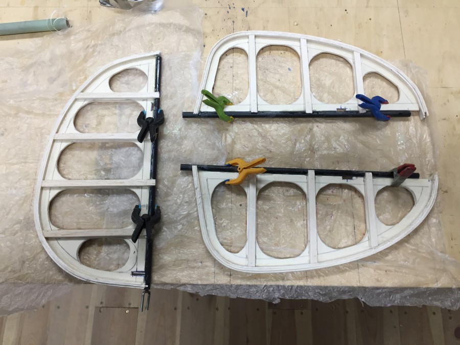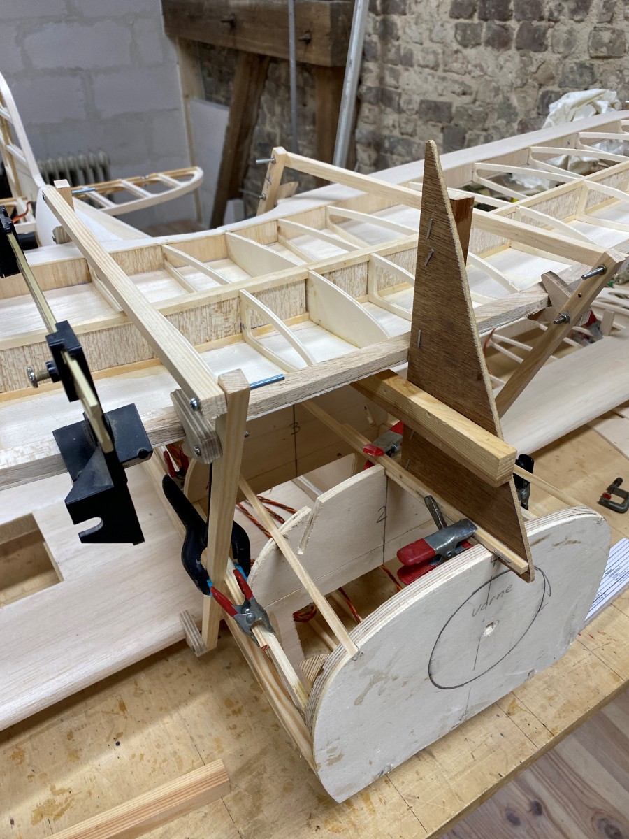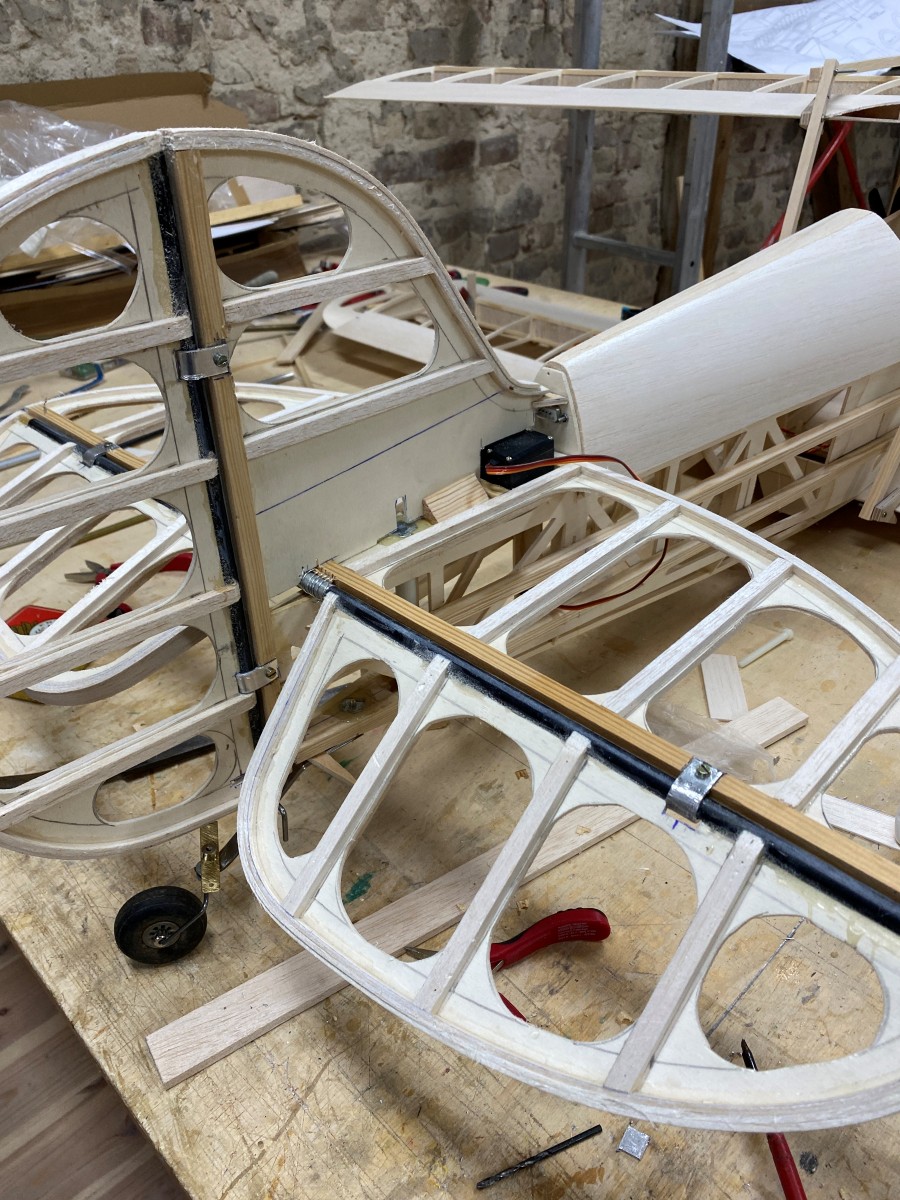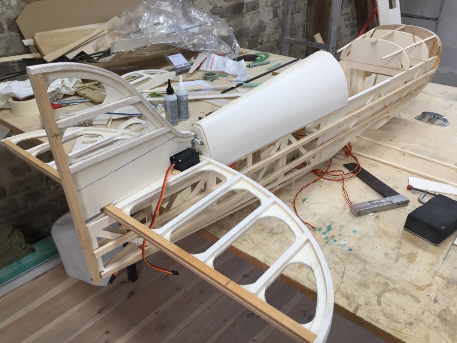 Der Rumpfrücken des Hecks ist beplankt, ebenso die Oberseite der unteren Fläche.