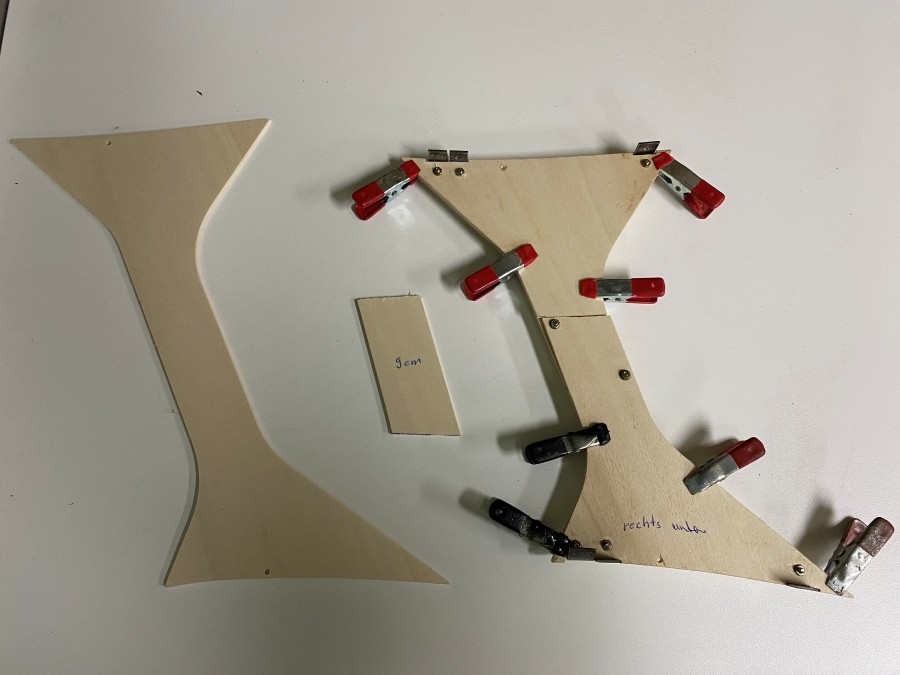 Metalllaschen zum Befestigen am Modell versehen und in der Mitte das entfernte Holzstück!